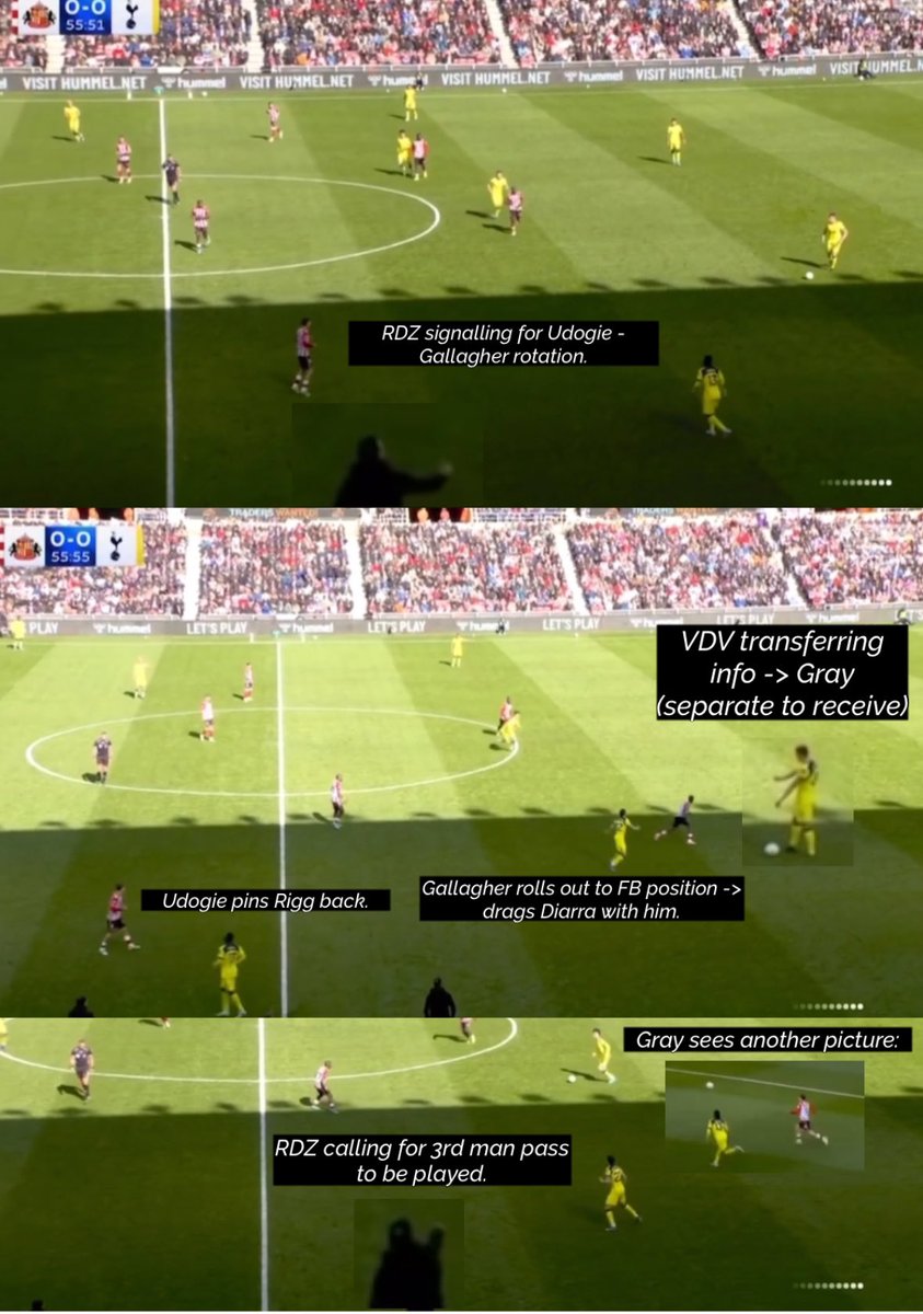 Udogie - Gallagher rotation sets up a familiar picture: looking to access the free man (Gallagher in Diarra’s cover shadow: dual pressing role) through a 3rd man combination.